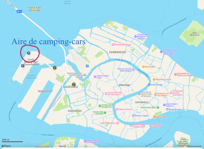 L’aire que nous avons indiqué précédemment fait également office de parking de nuit. N’y étant pas resté pour dormir, nous ne pouvons témoigner des conditions de cet emplacement la nuit, il était cependant très calme de jour et également très propre. Mais gardez en tête qu’il s’agit d’un parking sur du goudron dans une zone plutôt industrielle. Pour un long séjour, il serait peut-être plus agréable de s’arrêter dans un camping avant le grand pont menant à la lagune de Venise. Et puisque nous parlons de ce fameux pont, sachez qu’il comporte plusieurs radars de vitesse. Amis nomades, vous voilà ainsi avertis!