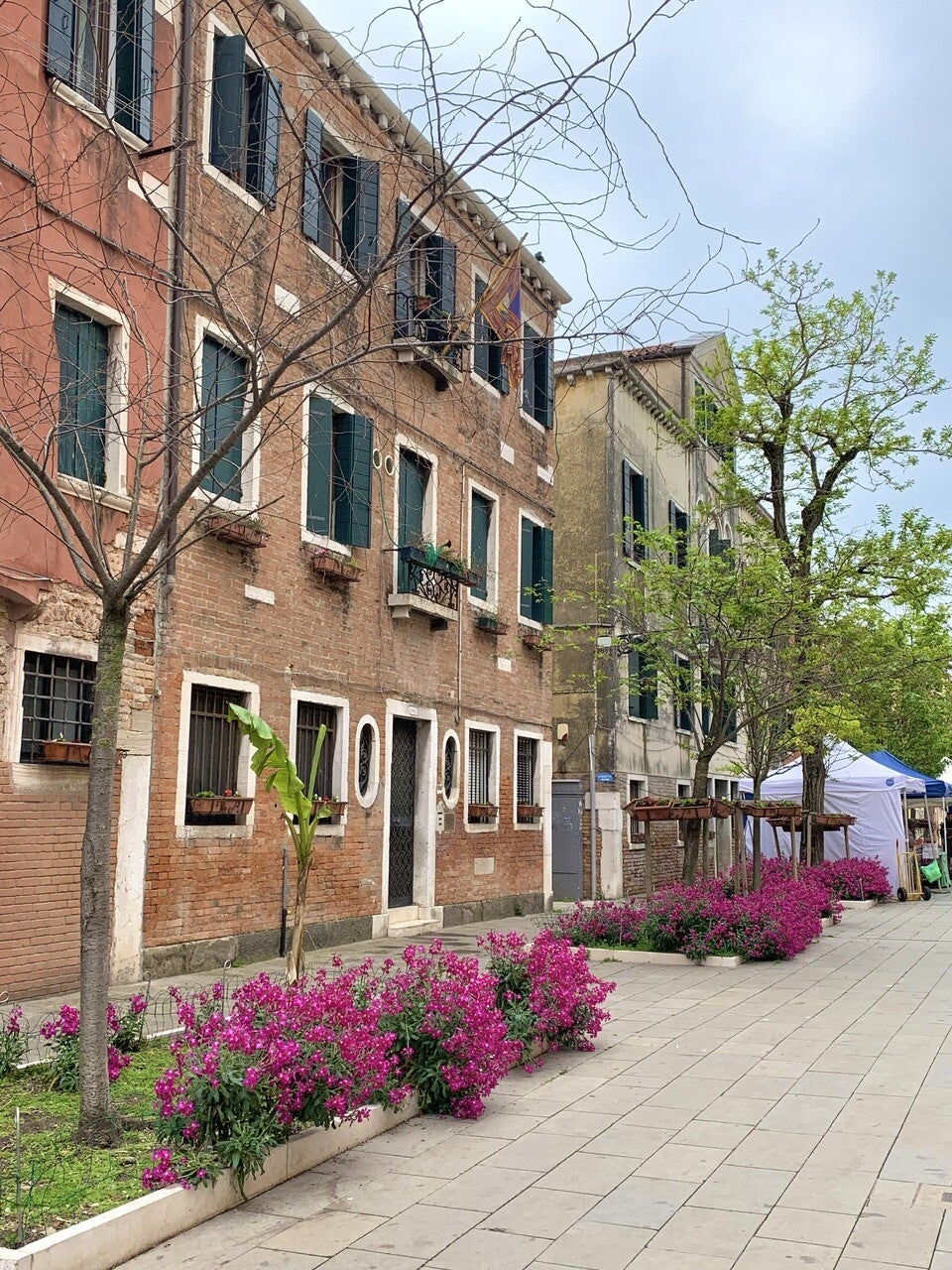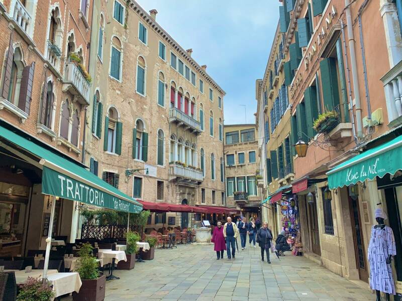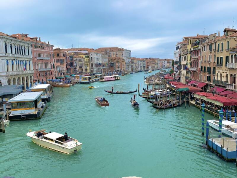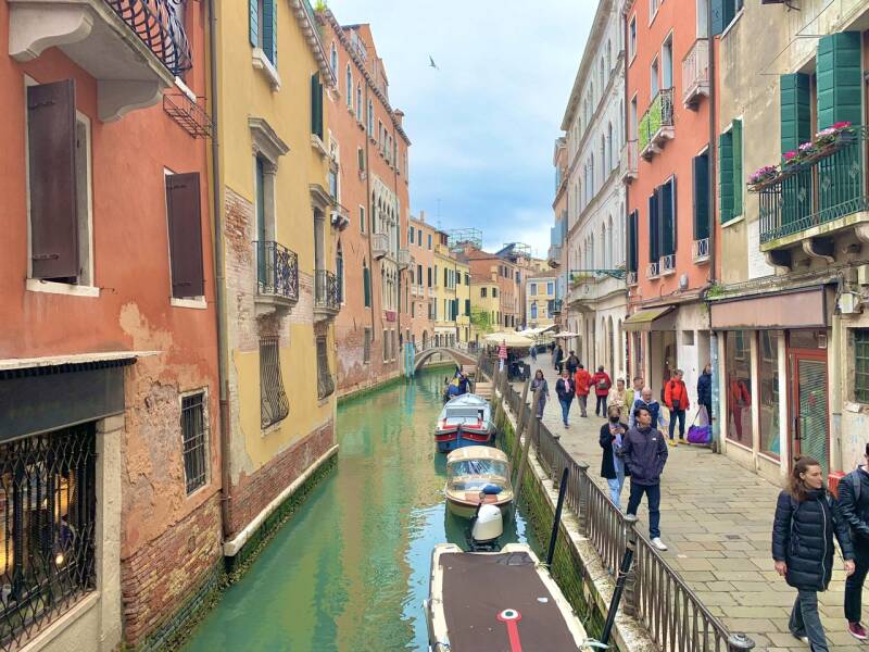 Nous sommes donc arrivés par une journée plutôt grise au parking « camper Park Tronchetto » qui apparaît sur Park4night et prévoit une place dédiée aux camping-cars pour une somme de 25 euros pour 12 heures de stationnement. Depuis là, vous pouvez prendre le Peoplemover pour une somme très raisonnable et rejoindre l’entrée de la vieille ville en 10 minutes. Pas très certains que les chiens y soient acceptés, nous préférons faire le trajet à pieds et voir à quoi ressemble cette partie de la ville absolument pas touristique. C’est donc en 35 minutes que nous rallions le parking à la Piazzale Roma, point de départ de bien des transports pour Venise. Soyons honnêtes, ce trajet n’était pas d’une rare beauté. Je suppose que si nous y retournons nous prendrons un bateau ou le Peoplemover au départ de Tronchetto.