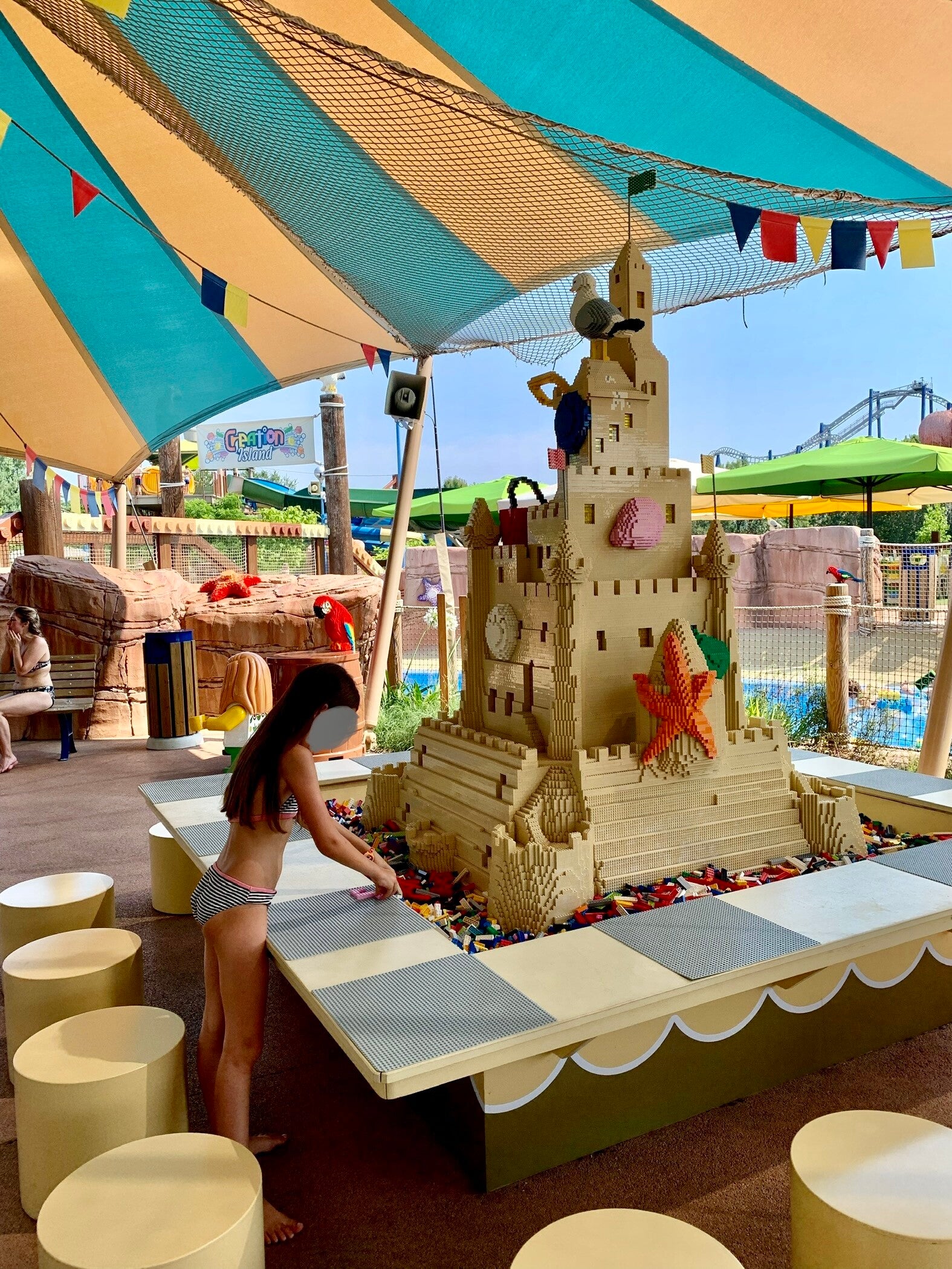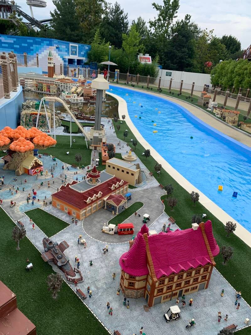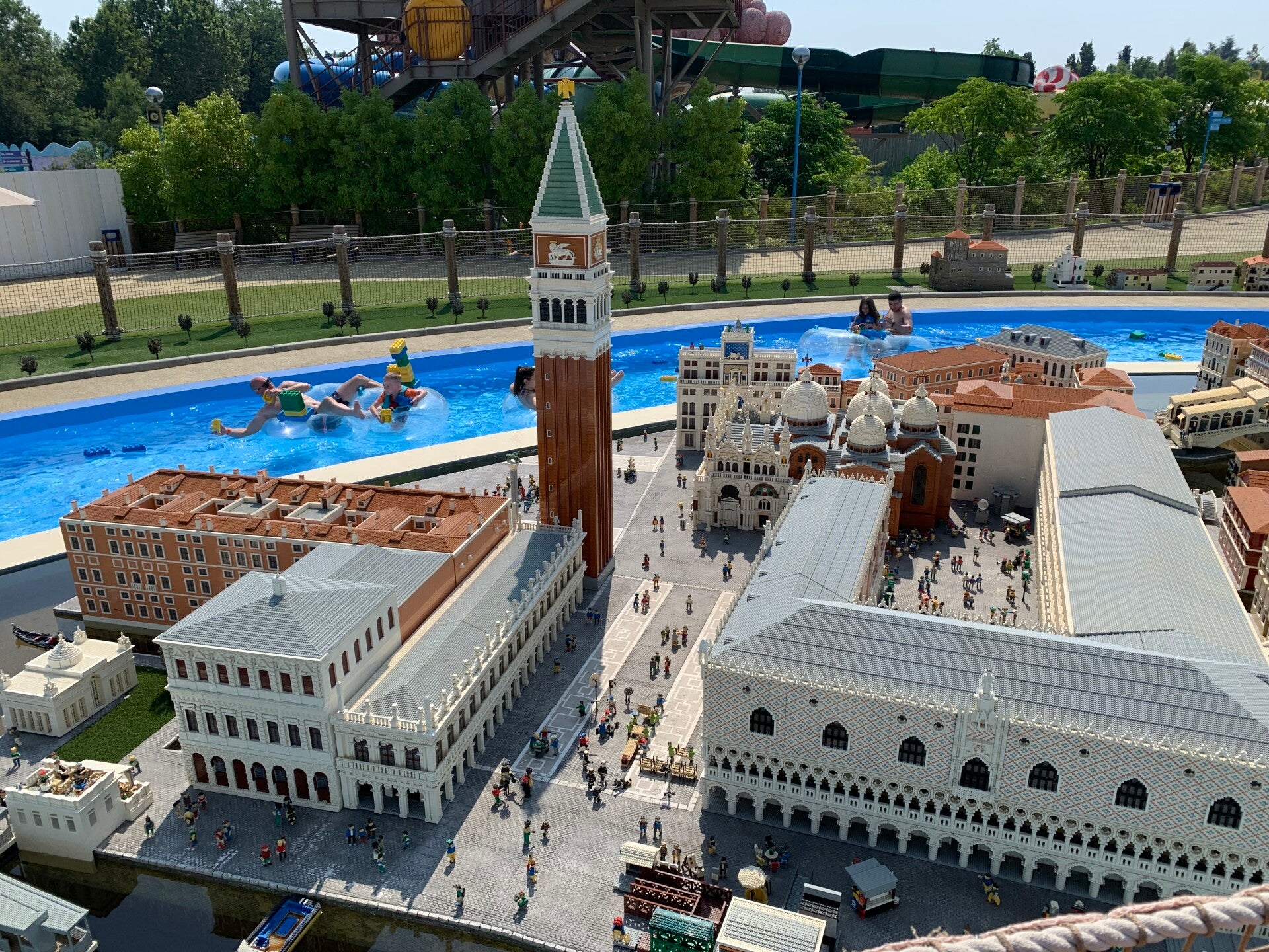 Surprise à la belle saison: il y a un parc dans le parc! Et oui, moyennant une nouvelle entrée à payer (oui, même malgré le pass annuel qui ne donne pas de réduction) vous aurez accès au Legoland Water Park. Un parc aquatique pas forcément grand mais qui est très agréable en été pour autant que vous preniez vos tongs avec. Nos plantes de pieds se souviennent tristement d’une première journée plutôt douloureuse sur les pavés brulants du parc… Les décors en Lego à la façon Legoland vous transportent dans un autre monde. Une rivières, un bassin avec diverses profondeurs, un bassin avec des duplos géants et quelques toboggans pout les plus petits, une très grande structure de jeux avec toboggans simples et une tour avec plusieurs départs de toboggans plus grands représentent l’ensemble des distractions aquatiques. La journée est largement plus que suffisante pour en faire le tour. Un coin construction de Legos ainsi qu’une Italie miniature toute en Legos occupent aussi bien un morceau de journée.