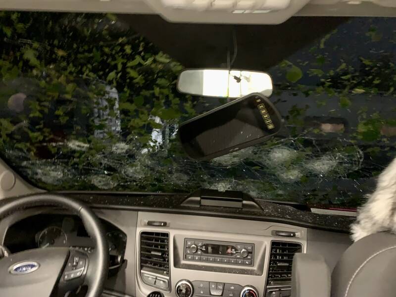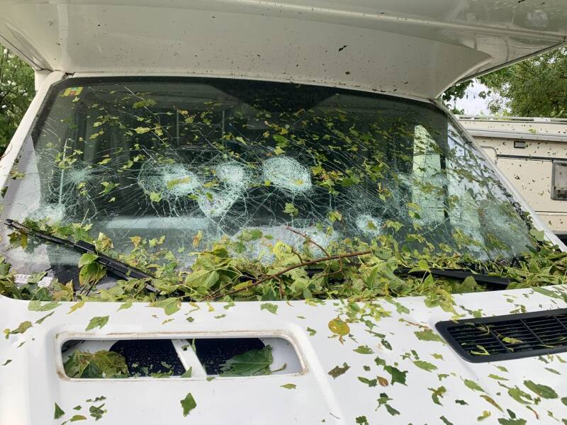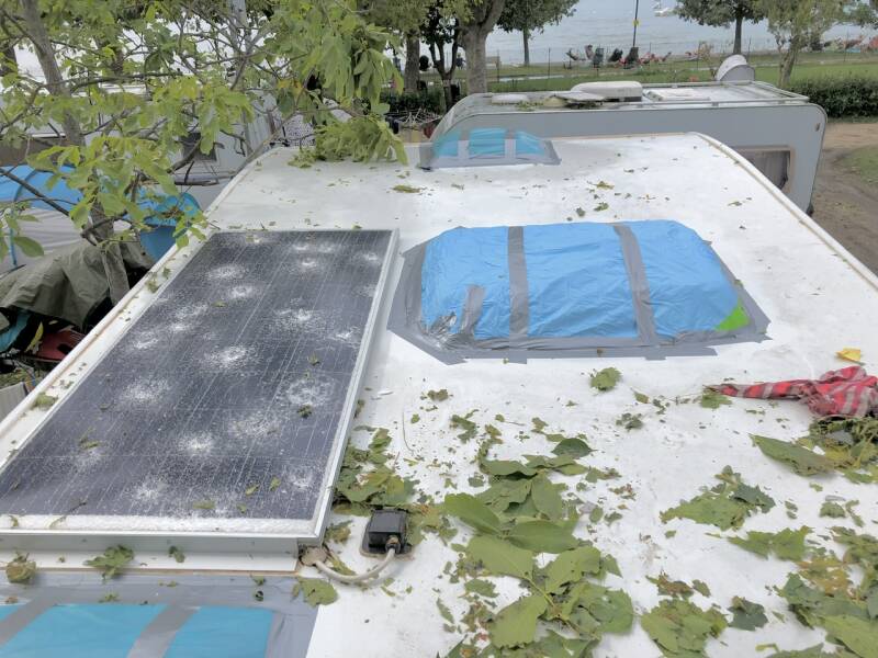 L’eau a laissé place à la grêle en quelques secondes. La grêle s’est transformée en véritables balles de tennis tombées du ciel. La presse racontera le lendemain, photos à l’appui, que les grêlons gros comme des pommes ont été pesés à passé 490 grammes. Nous avons donc juste eu le temps de tous s’entasser entre les deux lits superposés à l’arrière du véhicule, partie la plus solide du camping-car. Nous avons utilisé les duvets et coussins pour boucher la vitre et se protéger, nous avons tiré le rideau ainsi que la porte du placard devant nous pour se protéger d’éventuels impactes. Et là… L’attente. Qui dure certainement 2 minutes mais qui en paraît 20. Les hurlements des enfants sont comme mis en sourdine sous tant de bruit. Le camping-car est secoué, démoli par la force de ces boules de glace qui tombent du ciel. On se croit dans un tambour infernal. Pendant une brève accalmie on se risque à jeter un œil hors de notre cachette et on constate la désolation: le pare-brise est détruit, les lanterneaux n’ont pas survécus, la pluie les feuilles, la glace, les bris de verre sont partout dans le camping-car. Dans le salon, dans la salle de bain, dans la capucine. Seul endroit sans stigmates de ce cauchemar: le lit superposé qui n’avait par ailleurs pas de lanterneau.