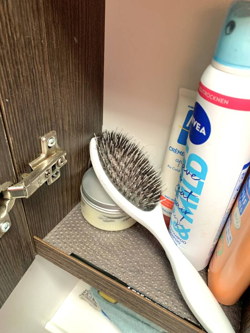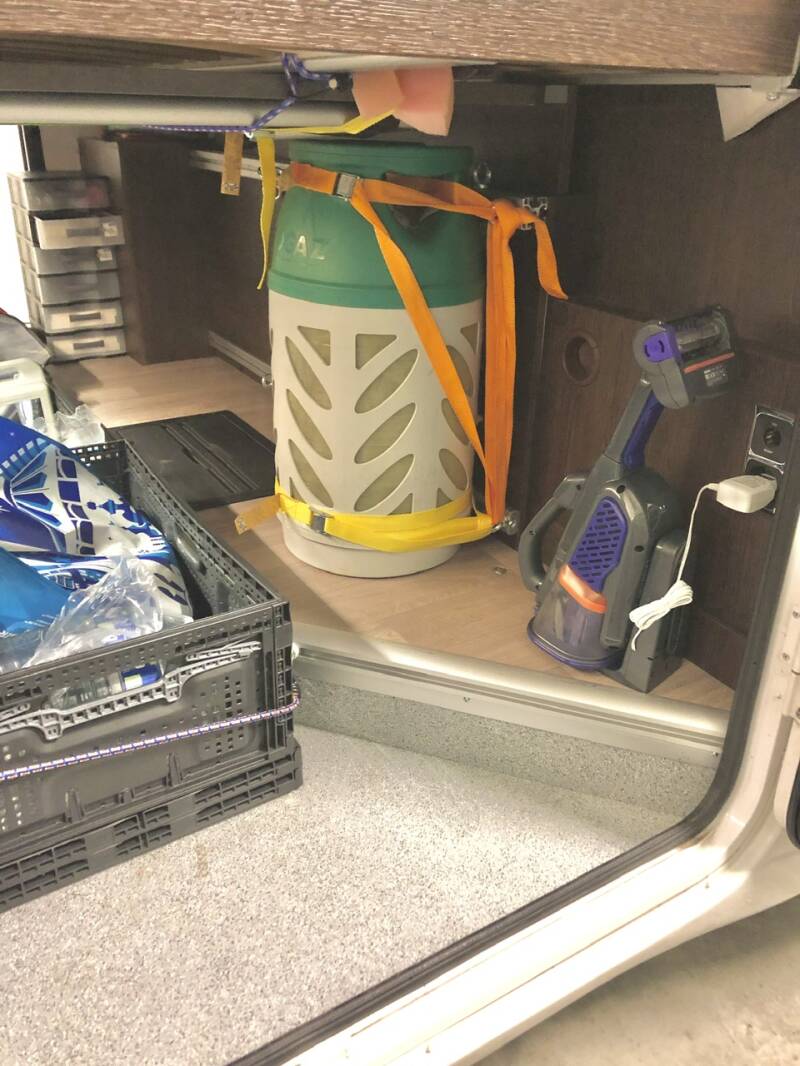 Un indispensable placard à vestes et chaussures se trouve à côté du frigo que nous avons équipé de cintres en métal de sorte à pouvoir tordre la boucle afin que ceux-ci ne tombent pas en voyage. Au sol de ce placard nous avons protégé avec du tapis antiglisse ce qui représente notre coin chaussures. Si nous devons partir avec plusieurs types de chaussures, le surplus est stocké dans un sac, dans la soute, de même que les équipements de neige ou de pluie en fonction de la météo. Dans ce même placard, nous avons fixé un crochet pour y ranger notre balais et sa pelle à cheni, souvent bien plus rapide à employer que l’aspirateur (que nous avons fini par ranger dans la soute devant l’efficacité de notre petit balais).