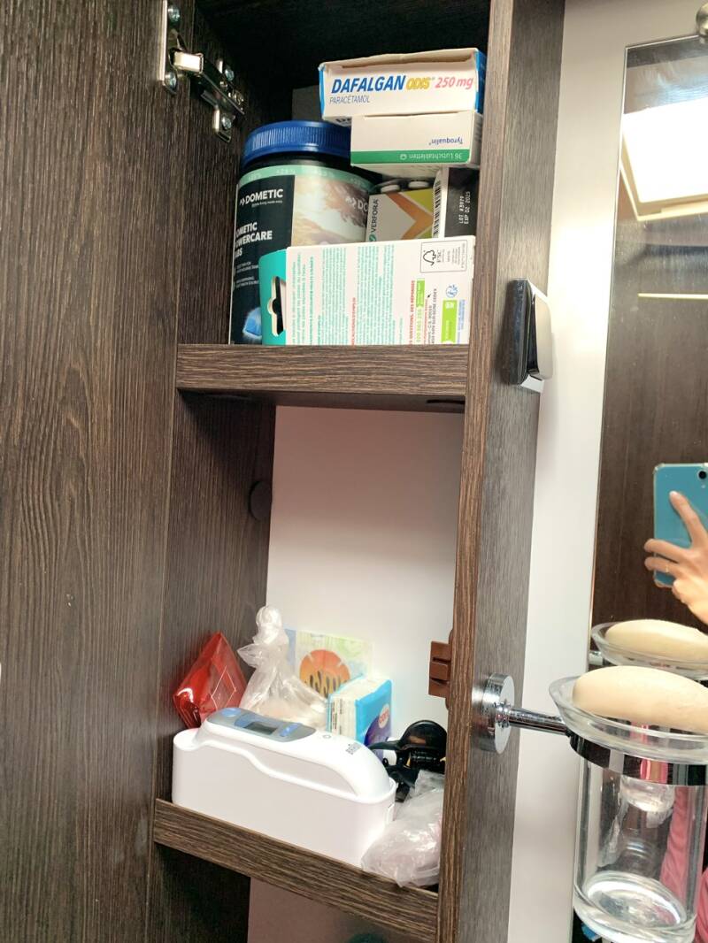 Pas grand chose de spécial à en dire sinon que là, c’est la loi de Tetris qui fait foi! Ici, du fait de leur configuration et du matériels que renferment les placards, les chutes sont fréquentes à l’ouverture de la porte. Nous sommes en train de réfléchir pour que M. Fenice imprime une petite étagère grâce à son imprimante 3D. Ayant des enfants, nous avons mis les pastilles wc (dont le format est plus facile à ranger que les flacons de liquide allongés) tout en hauteur avec les médicaments, hors de portée de leurs intentions pas forcément judicieuses.