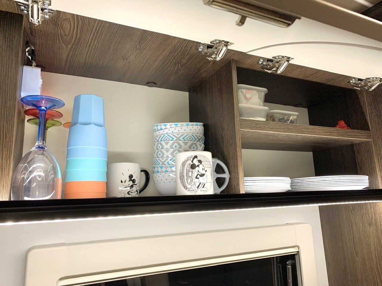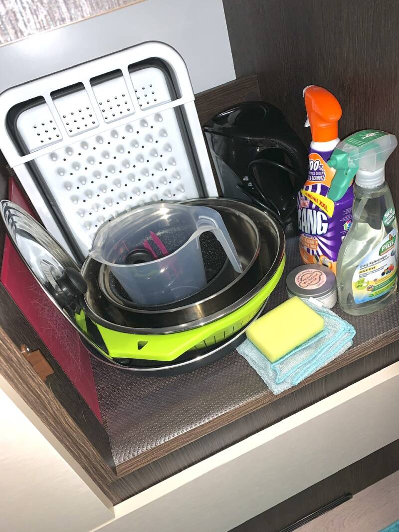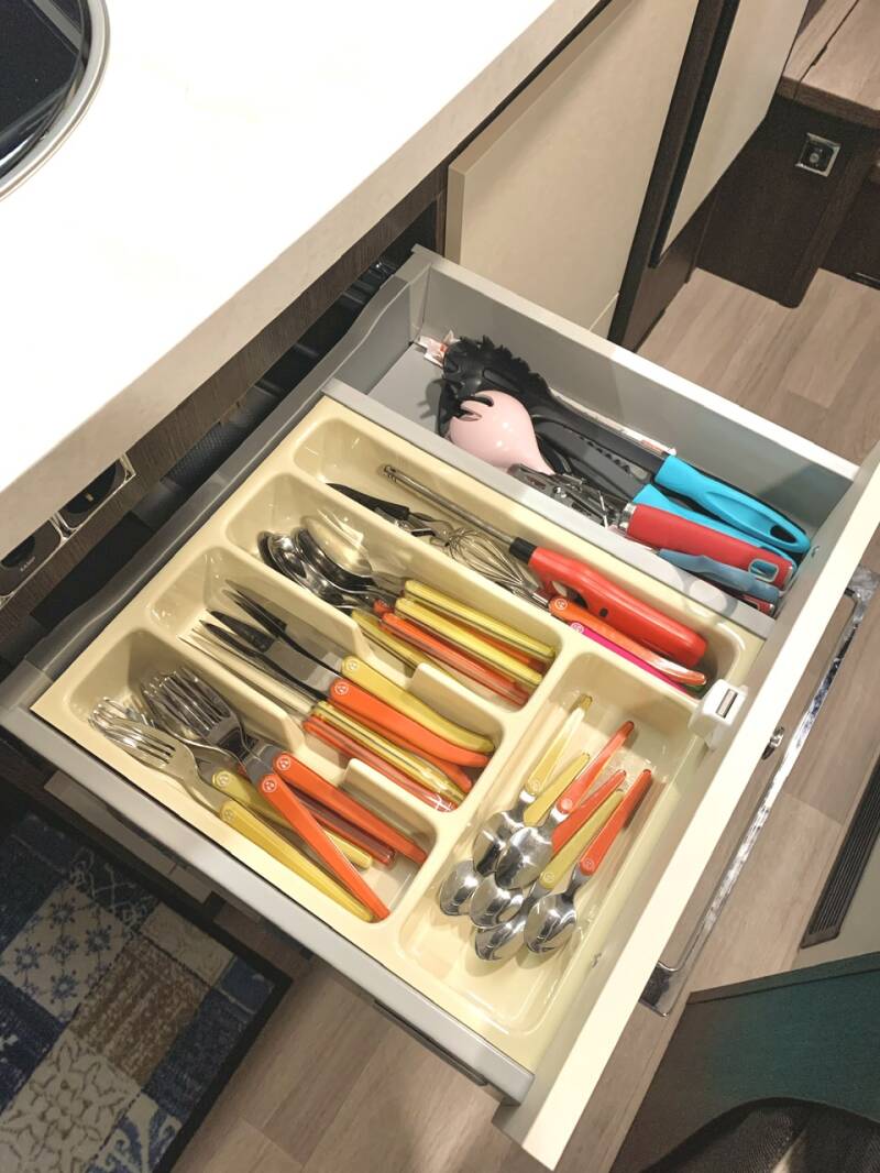 Aucun rangement organisé spécialement installé pour la vaisselle. La plupart est en mélamine et ne fait pas de bruit quand nous roulons. Afin de gagner en place et en poids nous rangeons très simplement la vaisselle posée et empilée dans les placards comme nous le ferions pour la maison. Nous n’avons jamais de problème de renversement à l’ouverture des placards contrairement à ce que l’on peut lire chez certains. Nous avons simplement mis une couche de revêtement antiglisse sur le fond des placards que nous n’avons même pas fixé au double-face.