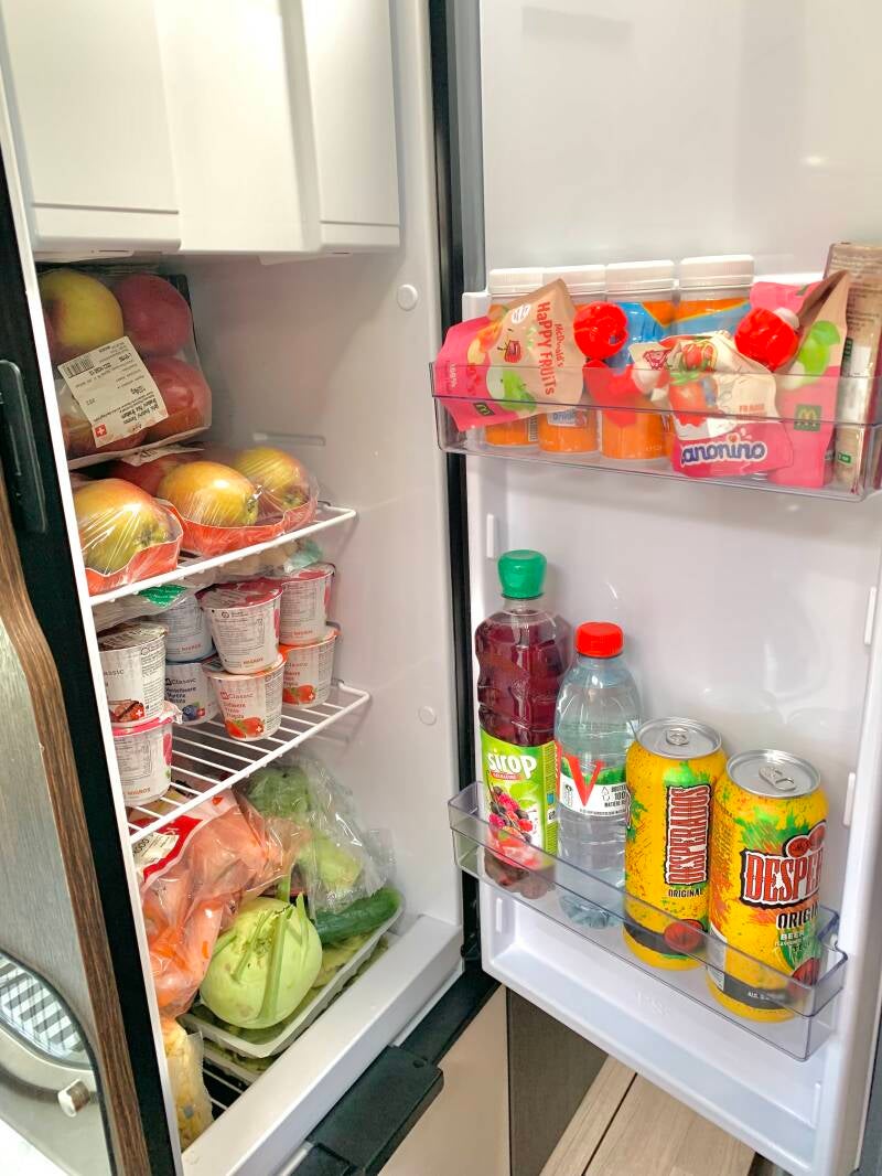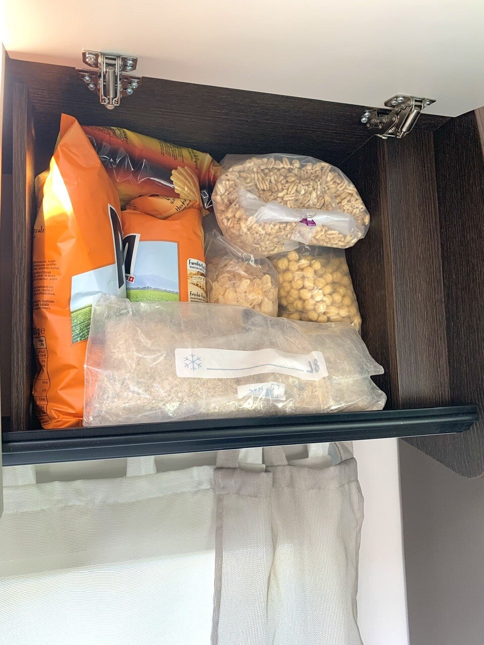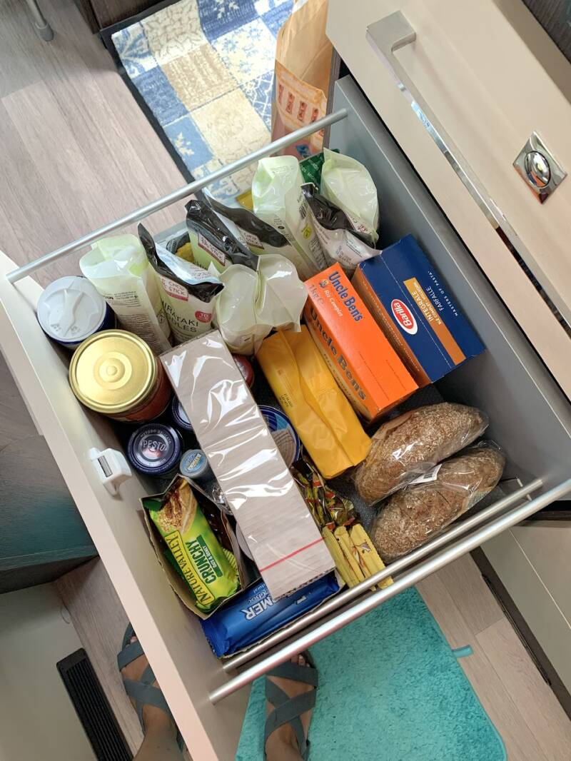 Un tiroir à provions où nous avons de la nourriture sèche prête à l’emploi (pâtes, riz, sauces en bocal, boîtes de légumes, snacks secs pour les enfants, sachets de bircher müesli préparés à l’avance pour les petit-déjeuners,…). Lors de grands voyages, nous utilisons un placard supplémentaire pour caler les chips de l’apéro qui sont volumineuses et les paquets de kellogs dont nous enlevons l’emballage cartons pour gagner en place. Les brioches emballées s’empilent également très bien et sont vite avalées le matin avant d’aller au parc d’attractions même si leur qualité nutritive est moralement discutable, de même que les kellogs d’ailleurs.