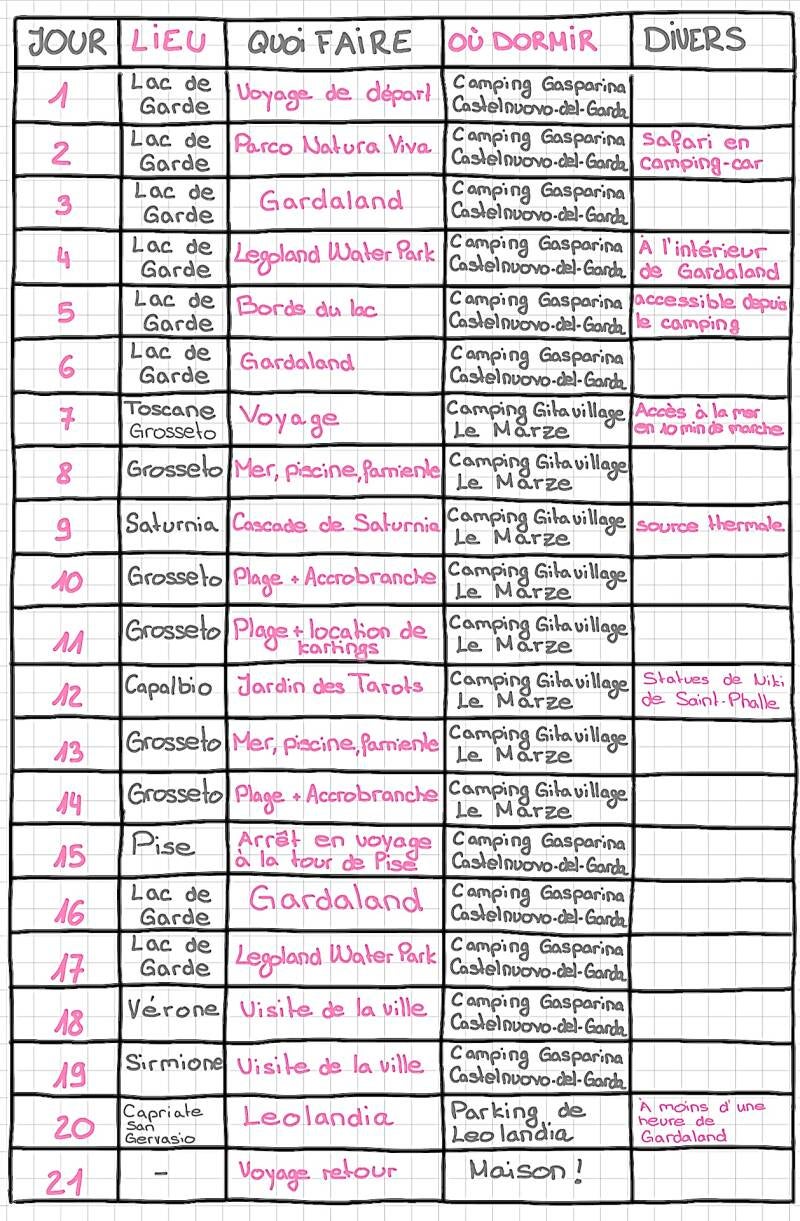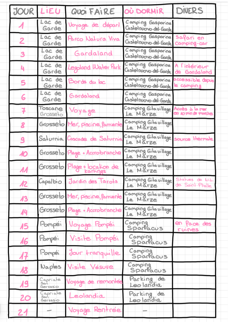 Je vais donc, cette fois, vous présenter deux tableaux: celui du voyage que l’on a réalisé avec ce qui était prévu si nous n’avions pas eu de tempête. Puis tout en bas de cet article, vous trouverez un tableau du plan de voyage que l’on s’était prévu à la base, incluant Pompéi et le Vésuve. Bonne découverte à vous!