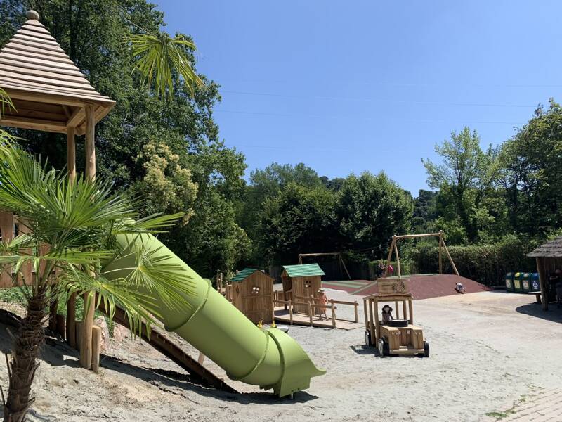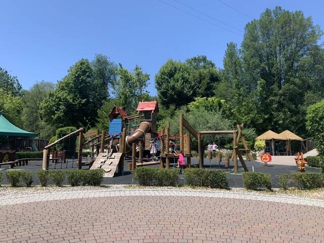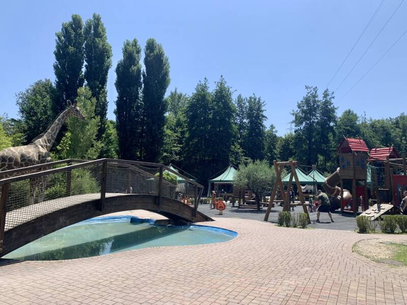 Il s’agit d’un zoo séparé en deux parties mais avec un billet unique. La première partie traditionnelle, et interdite aux chiens, permet de se promener entre les enclos et possède de très très belles places de jeu qui ont ravi nos 3 petits Fenice. S’y trouvent également des restaurants, coins pique-nique et une boutique. Nous en avons fait rapidement le tour pendant que toutou Fenice restait au plus frais à l’intérieur de Benny sur le parking camping-car gardé par un agent de sécurité du zoo. (Attention si vraiment vous prenez aussi la décision de laisser votre chien un court instant dans votre camping-car testez toujours avant en cet endroit à l’aide d’un thermomètre la chaleur intérieure. Je ne recommande pas de procéder ainsi dans un fourgon dont la carrosserie s’apparente plus à une voiture et qui se transformera rapidement en four malgré toutes vos précautions. Suivez ce lien pour que tout se passe au mieux pour lui et qu’il reste en parfaite sécurité avec la chaleur éventuelle et les dangers: Notre chien en camping-car)