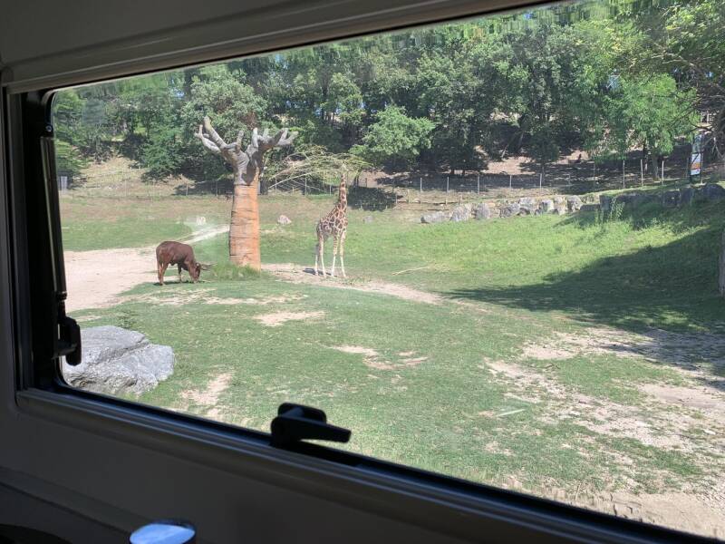Puisque nous sommes arrivés tard sans prendre le temps de bien poser les cales, ni de poser judicieusement Benny sur notre parcelle pour ne pas déranger les personnes déjà couchées, nous profitons de ressortir le camping-car et de rouler 20 minutes jusqu’au Parco Natura Viva afin de réaliser une petite envie que j'ai depuis quelques temps: réaliser un safari en camping-car!