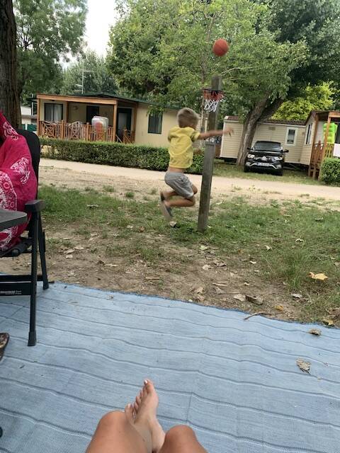 Le camping abrite un bar judicieusement placé entre la piscine et la place de jeu. C’est là que nous avons pu savourer quelques Aperol spritz avec M. Fenice et notre loulou tandis que les enfants s’amusaient dans les balançoires et toboggans.