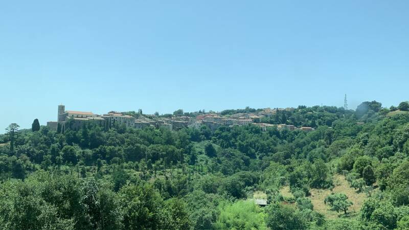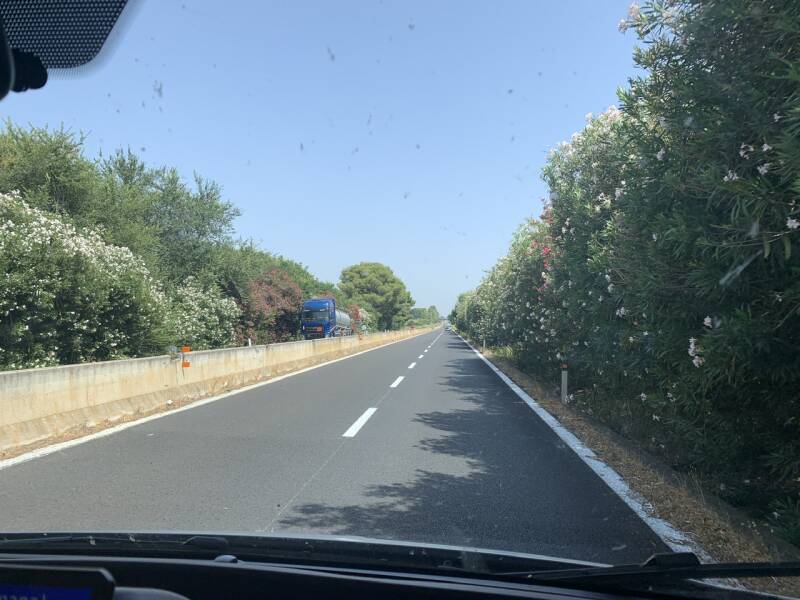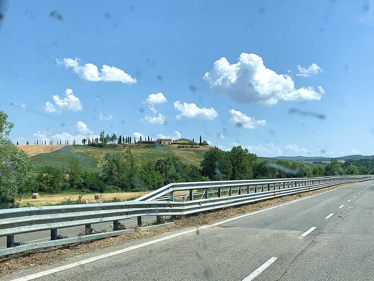 Nous prenons la route pour nous rendre en Toscane, à Grosseto, dans un camping en bord de mer. Il nous faudra environ 5 heures pour rejoindre notre destination. Les paysages le long des routes sont merveilleux et la journée n’est pas perdue, bien au contraire, pour nous qui ne sommes jamais allés dans cette région auparavant. Tout nous parait si beau: la végétation différente, tant de fleurs colorées le long des routes, les cyprès, les oliviers, les collines avec leurs maisons en pierre au sommet. Nous avons l’impression de voyager dans une carte postale.