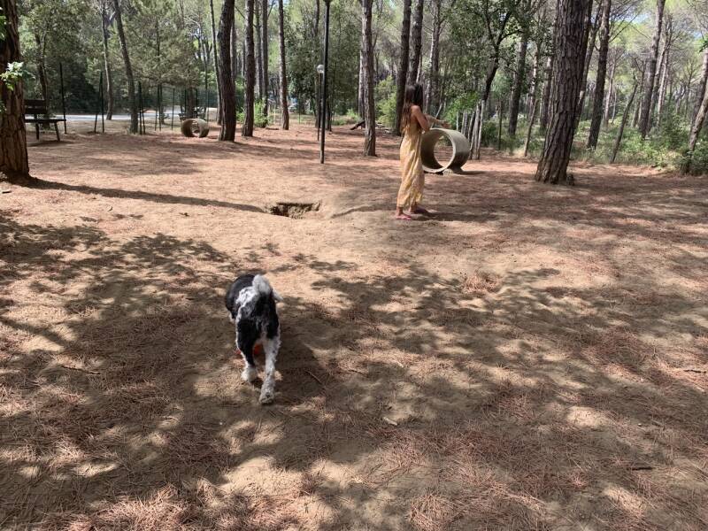 Aujourd’hui nous profitons du camping et de ses avantages. À environ 10 minutes à pieds de la mer (sous réserve de ne pas être logé au fond du camping), ce camping est absolument dog friendly et la plage y est autorisée aux chiens (mis à part la zone des chaises longues à louer). Il possède un parc à chien avec des obstacles d’agilité, des douches pour les chiens qui reviennent de la plage et enfin, nos compagnons sont autorisés presque partout dans le camping. Bien qu’il y ait eu beaucoup de chiens dans le camping, nous avons constaté beaucoup de respect (chiens tous bien en laisse, pas de déjections abandonnées au sol ni au camping, ni sur la plage, pas de chiens bruyants durant notre séjour). Malheureusement Toutou Fenice qui n’ose pas marcher dans le sable et qui n’a de toutes façons pas encore envie de poser sa patte, ne profitera pas vraiment de ces installations.