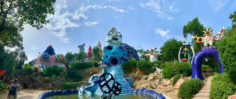 Partis à sa découverte sans conviction, n’étant tous les deux pas plus fans que cela de cette artiste, nous avons eu une belle surprise dès notre arrivée. Le jardin est envoûtant et force le respect face à tant de travail. Les sculptures y sont gigantesques, de toutes les couleurs et ce n’est pas rare de pouvoir se promener à l’intérieur-même des œuvres. Quelques œuvres de son époux Jean Tinguely y sont également exposées pour le plus grand plaisir de grande Fenice qui l’aime particulièrement après avoir visité son musée à Bâle, en Suisse.