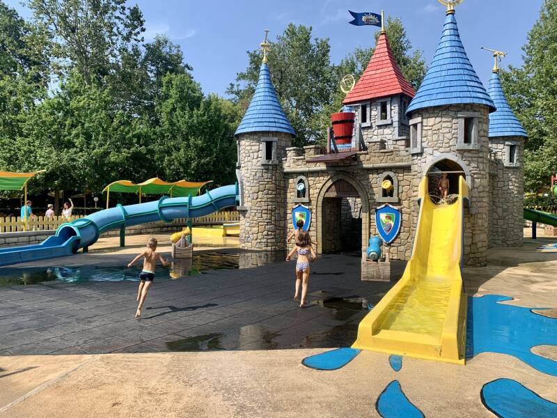 Une place de jeux d’eau bien agréable en contre-bas de l’entrée de Gardaland accessible aux enfants jusqu’à 1,40m.